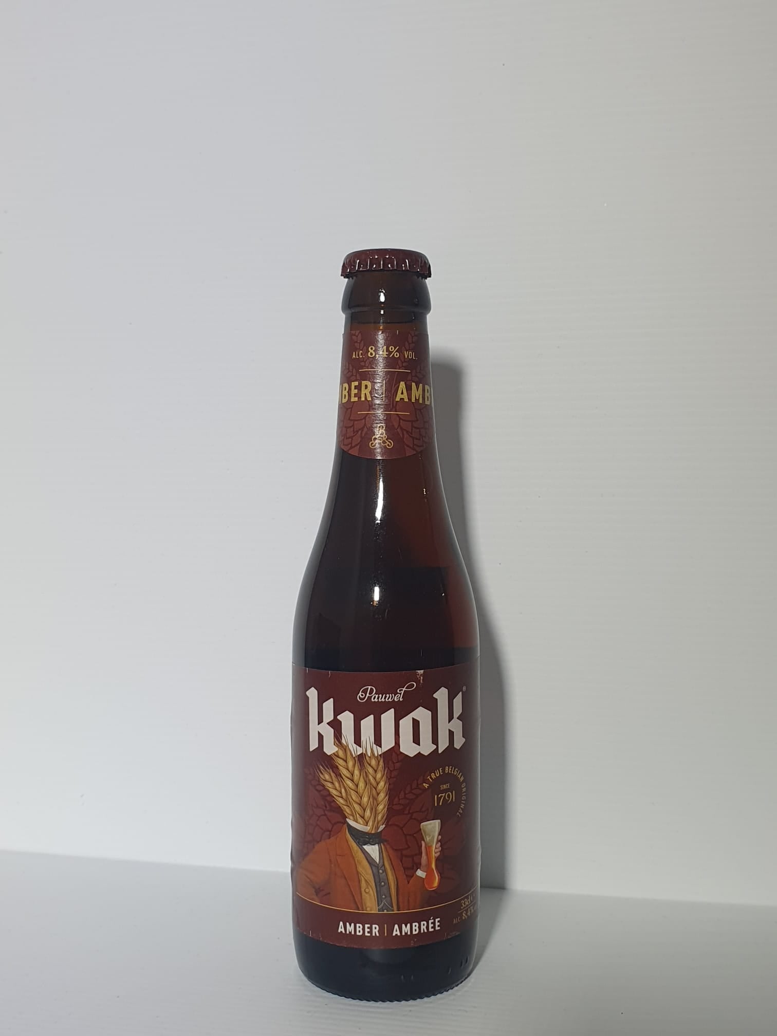 La Kwak è riconoscibile per il suo colore ambrato intenso e brillante e per la sua densa schiuma color crema. Il legno chiaro del portabicchiere crea un piacevole contrasto con la birra.