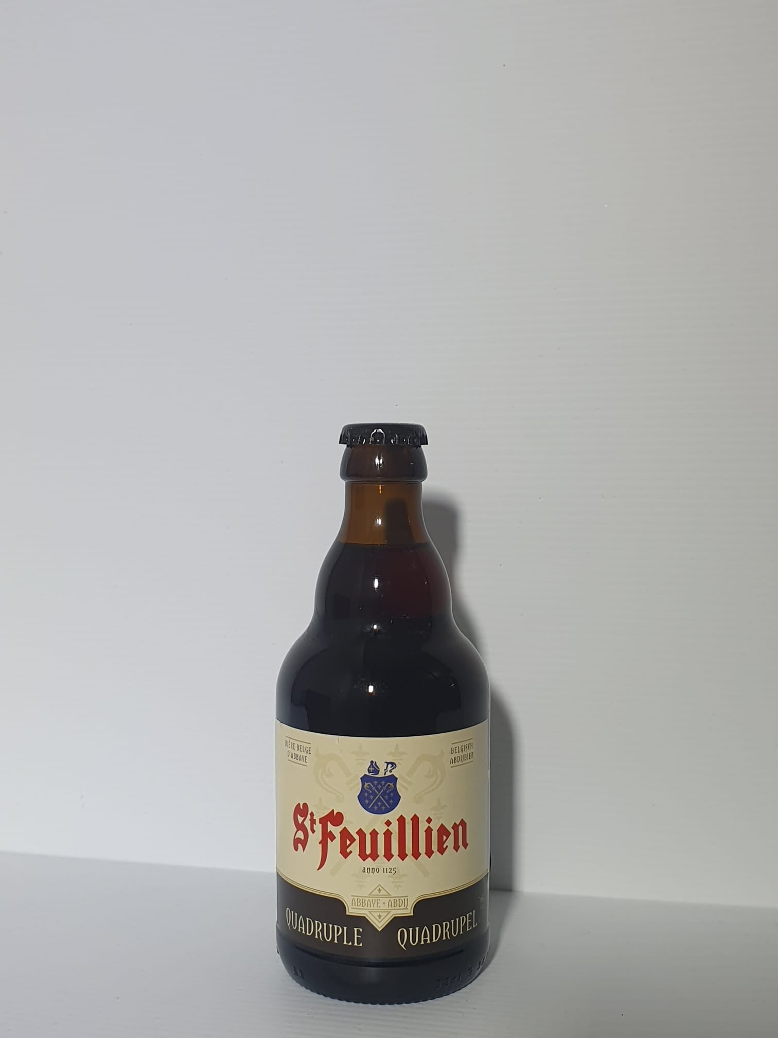 Bottigla 0.33l. La St-Feuillien Quadruple è una birra molto scura e densa. È notevolmente alcolica. Si distingue per un aroma complesso e finemente caramellato, con sfumature di vino Madeira e frutta candita e un tocco intenso di esteri di fermentazione (tipo banana). Un leggero sentore di luppolo (stile inglese) completa il tutto. Il palato è lungo con un corpo potente costruito sulla densità e sull'estratto apparente generoso. L'amaro è presente ma dolce e si fonde armoniosamente con la struttura maltata. La selezione di malti speciali esalta il lato cioccolatoso con le sfumature di cocco. La saturazione è media.